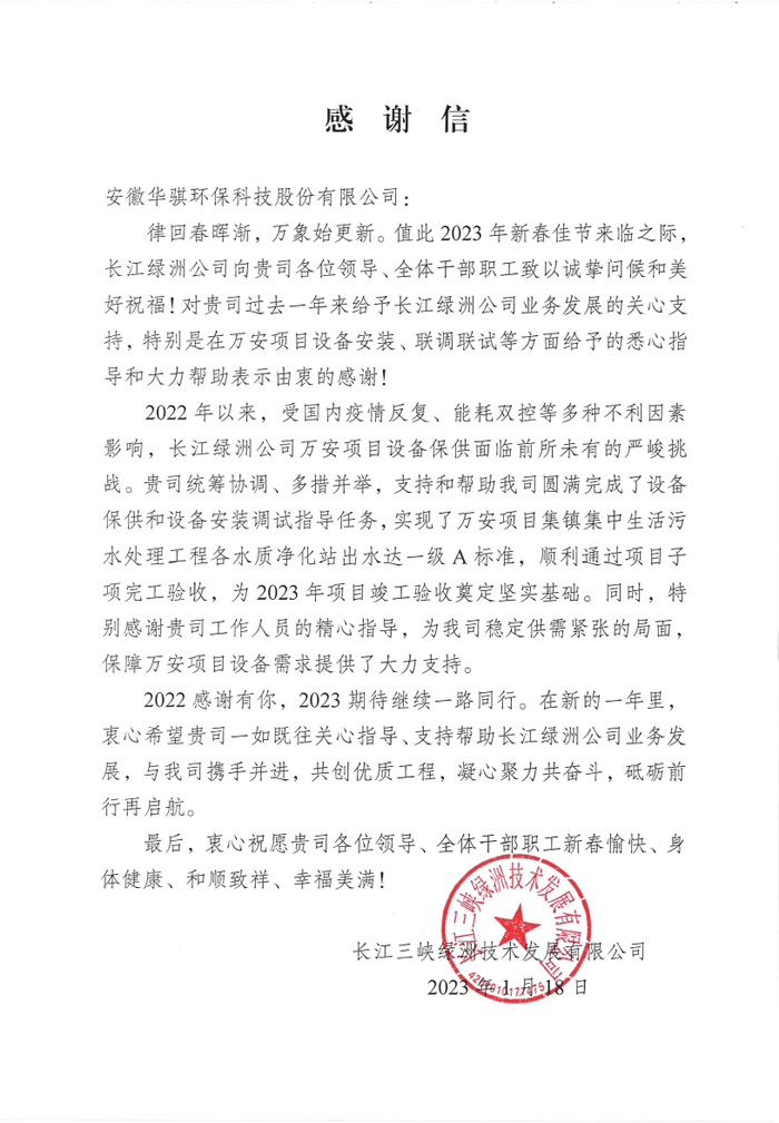 感謝信寫(xiě)道:“2022 年以來(lái),受國(guó)內(nèi)疫情反復(fù)、能耗雙控等多種不利因素影響,長(zhǎng)江綠洲公司萬(wàn)安項(xiàng)目設(shè)備保供面臨前所未有的嚴(yán)峻挑戰(zhàn)。華騏環(huán)保統(tǒng)籌協(xié)調(diào)、多措并舉,支持和幫助我司圓滿完成了設(shè)備保供和設(shè)備安裝調(diào)試指導(dǎo)任務(wù),實(shí)現(xiàn)了萬(wàn)安項(xiàng)目集鎮(zhèn)集中生活污水處理工程各水質(zhì)凈化站出水達(dá)一級(jí) A 標(biāo)準(zhǔn),順利通過(guò)項(xiàng)目子項(xiàng)完工驗(yàn)收,為 2023 年項(xiàng)目竣工驗(yàn)收奠定堅(jiān)實(shí)基礎(chǔ)。同時(shí),特別感謝貴司工作人員的精心指導(dǎo),為我司穩(wěn)定供需緊張的局面保障萬(wàn)安項(xiàng)目設(shè)備需求提供了大力支持。”
