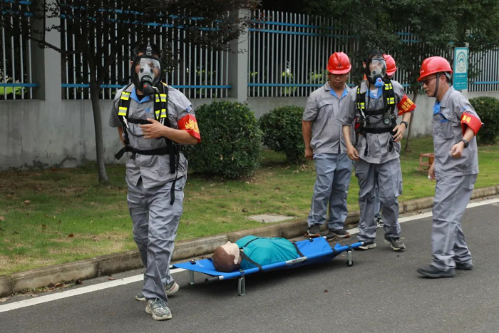 當(dāng)天下午2點(diǎn),演練正式開始。演練場(chǎng)景模擬華騏污水廠磁混凝沉淀池污泥泵房?jī)?nèi)員工在處理污泥泵出口壓力不正常過程中,未遵守作業(yè)規(guī)程,違規(guī)摘掉正壓送風(fēng)長(zhǎng)管呼吸器,吸入有毒氣體后中毒暈倒?,F(xiàn)場(chǎng)人員發(fā)現(xiàn)后立即上報(bào)公司領(lǐng)導(dǎo),經(jīng)理趕赴事故發(fā)生區(qū)域,成立現(xiàn)場(chǎng)指揮部,啟動(dòng)《有限空間作業(yè)事故專項(xiàng)應(yīng)急預(yù)案》,應(yīng)急救援人員穿戴正壓式空氣呼吸器,攜帶擔(dān)架深入污泥泵房將受傷人員救出;醫(yī)療救護(hù)人員對(duì)中毒人員進(jìn)行心肺復(fù)蘇,救援的同時(shí)撥打 120 急救電話進(jìn)行醫(yī)療救護(hù)求助。最終在各單位的全力配合下,圓滿完成此次應(yīng)急救援任務(wù)。